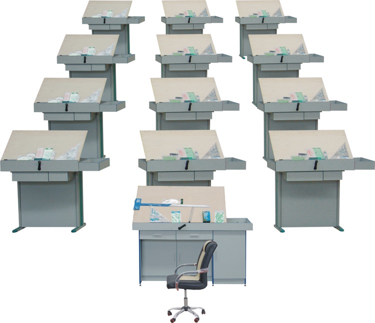 桌面可調(diào)節(jié)傾角,桌側(cè)面折疊翻開右放置儀器、工具,下面抽屜供放學習資料、工具書等。 教師演示桌除上課時供投影儀操作作用外,主要用于輔導學生時現(xiàn)場批改作業(yè)及示范教學之用。 本系列教學設(shè)備不但適用于制圖教學,也同樣適用于繼課程后的設(shè)計及畢業(yè)設(shè)計。 對于非機、非土類專業(yè),為僅使用2號以下的圖幅,可選用小號制圖桌,占地面積相應(yīng)減小。