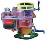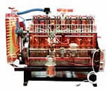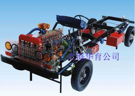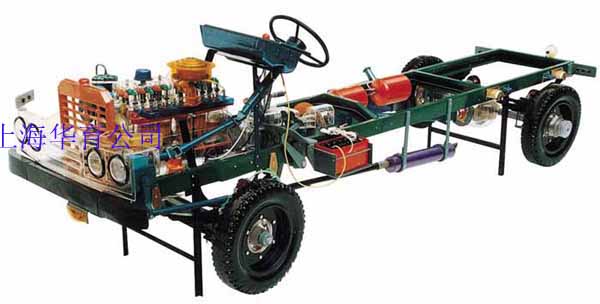 本品選用透明有機玻璃制作,內中部件均以硬質塑料料加工,用 螺絲固定在金屬高溫烘漆而成的車架上。各總成部分都以壓模成形加 工,代替過去膠粘合的方法,使產品在強度上有很大提高。發動機總成用電機驅動,在油門處設有調速裝置,能演示發動機轉速高低。離合器分離明顯,操縱靈活,離合器外殼整體壓模而成,變速箱和各檔齒輪用各種顏色表示,換檔靈活,手制動美觀。后橋外形壓模而成,內中主減速、差速轉動自如,輪轂剎蹄壓模成型,剎蹄可調節,前橋輪鼓可調整,轉向裝置以及電瓶、油箱、水箱,制動管路分布清楚一目了然。電路采用對插件前后分布,燈架、風窗、儀表板、后燈架用透明有機玻璃壓模成整體美觀逼真。