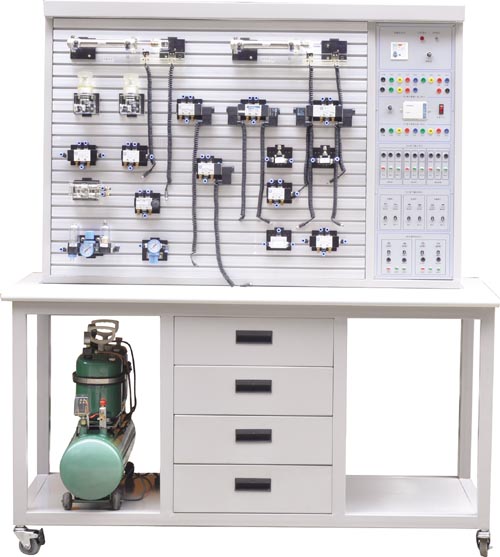 氣動PLC控制實(shí)驗(yàn)臺主要由實(shí)驗(yàn)桌及實(shí)驗(yàn)支架、氣動元器件、電氣控制器件等組成。