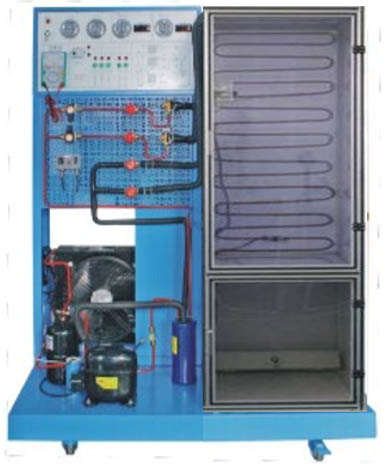 采用雙層亞光密紋噴塑結構,造型新穎。可滿足冷水系統和直接蒸發系統的工作原理,最上層布置制冷控制溫度檢測裝置,右邊可直觀展示制冷系統結構;后部設有冰水蒸發器,正面設有電源控制及測量儀表功能板。底部裝有四個帶剎車的萬向輪,便于移動和固定。、可直觀的演示一些物理概念,